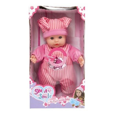 Sweet Smile játékbaba hanggal - 30 cm Ölelgesd és szeretgesd a Sweet Smile játékbabát! A Sweet Smile játékbaba hanggal nagyobb, műanyag fejjel, karokkal és lábakkal készült játékbaba, puha töltéssel A Sweet Smile játékbaba hanggal - 30 cm csíkos esti