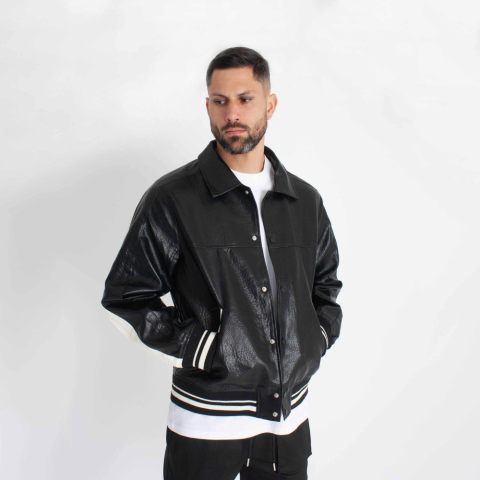 Regular Fit, fekete galléros műbőr dzseki, fehér részletekkel, rövid fazon, elöl patentos, két oldalzsebbel és egy belső zsebbel, gumis kézelővel és alsó szegéllyel Model: 185 cm/ 85 kg/ XL-es méret