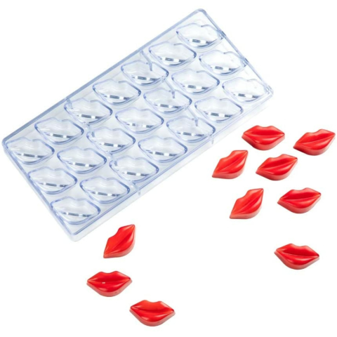 polikarbonát bonbon forma-ajak A polikarbonát formával 21 darab ajakformájú bonbon készíthető. A forma teljes mérete:75mm x 135mm x 24mm. Csokoládébonbon mérete: 48mm x 21mm. Mogatógépben nem tisztítható. A bonbonforma anyaga: polikarbonát.