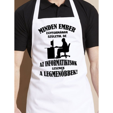 Szakmás kötény, legmenőbb informatikus. Minden ember egyformának születik, de az informatikusok lesznek a legmenőbbek felirattal. Szuper ajándék választás névnapra és születésnapra is. Lepd meg munkatársadat vagy egy családtagodat egy ilyen vászon köténny
