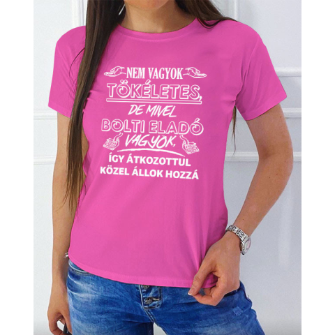 Szakmás női póló, tökéletes bolti eladó. Nem vagyok tökéletes, de mivel bolti eladó vagyok, így átkozottul közel állok hozzá feliratos póló nőknek. Ajándék bolti eladóknak születésnapra, névnapra, karácsonyra. Többféle színben és fazonban rendelhető 100%
