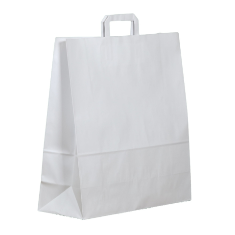 A szalagfüles papírtáska 45×48+17 cm fehér színben környezetbarát és elegáns megoldás szállításra, tárolásra és csomagolásra egyaránt. Az anyaga fehér nátron papír, mely 80-100 g/m2 vastagságú, a fül a táska színével megegyező, 6 rétegben hajtott papír, mely erős ragasztással kerül rögzítésre. Mivel lebomló anyagból készül, nem szennyezi a környezetet, mint a nejlonzacskó. A szalagfüles papírtáska 45×48+17 cm fehér színű kiviteléből akár egy d