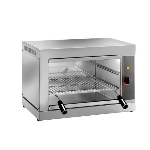 Állítható krómozott rácspolc, kivehető és tisztítható cseppfogó tálca, kvarclámpás melegítés, hőfokszabályzó, visszajelző lámpa. Munka magasság: 90-170 mm Teljesítmény: 2,2 kW/230V-1N~ Mérete: 560x360x390 mm