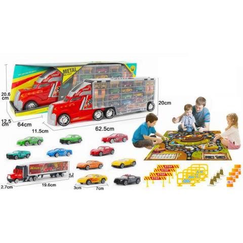 Ez a nagyméretű autószállító kamion és a hozzá tartozó forgalmi pálya szett igazi élményt nyújt a kis járműrajongóknak! A 63,5 cm hosszú teherautó nemcsak rengeteg kisautót és kiegészítőt tartalmaz, hanem egy 50 × 50 cm-es játé