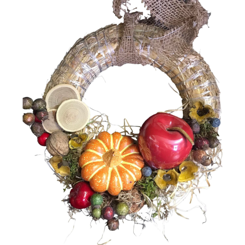 Szalma alapú kopogtató tök és alma termésekkel díszítve. Mérete: 25 cm. Őszi ajtó dekor.
