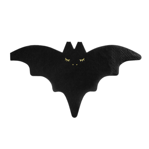 Papírszalvéták Denevér fekete színben, arany metál nyomattal, méret kibontás után kb. 32 x 18 cm, mérete összeszerelés után kb. 16 x 9 cm. (1 db / 20 db.)