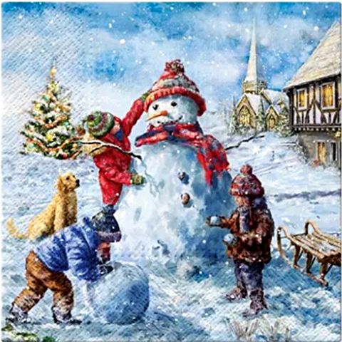 Három rétegű, 33x33 cm-es méretű dekorszalvéta dekupázs-technikához, téli játékok, hóember építés