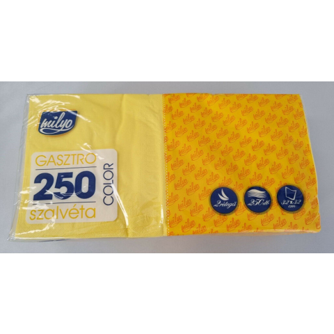 MILYO szalvéta – 250 db, 2 rétegű, 32x32 cm, sárga színű Tegye ragyogóbbá étkezőasztalát a MILYO sárga színű szalvétákkal! Ez a 2 rétegű, kiváló minőségű szalvéta tökéletes választás mindennapi használatra, családi eseményekre, partikra vagy vendéglátóhel