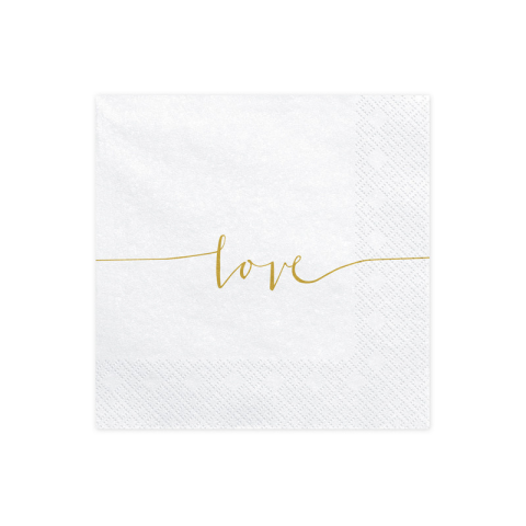 3 rétegű szalvéta fehér színben, arany Love felirattal, méret kibontás után kb. 33 x 33 cm, mérete összeszerelés után kb. 16,5 x 16,5 cm. (1 db / 20 db.)