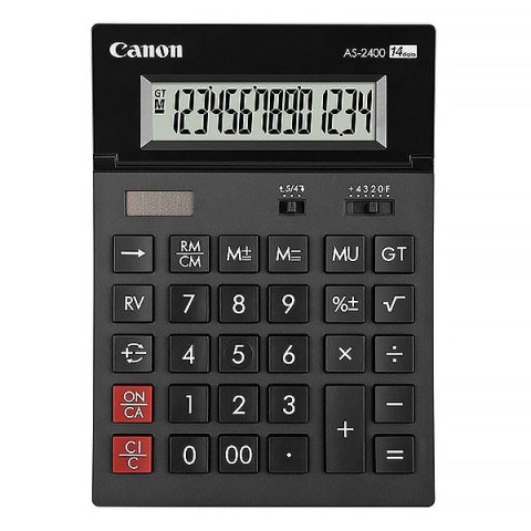 Számológép asztali CANON AS-2400 környezetbarát 14 digit Az AS-2400 számológép funkciók széles körét kínálja. A csúsztatható választókapcsoló könnyű tizedespont-kiválasztást és kerekítést tesz lehetővé. A végösszeg-memória automatikusan tárolja a rész