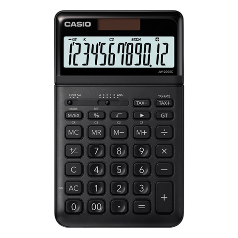 Számológép asztali CASIO JW 200 SC 12 digit fekete - 12 számjegyű nagyméretű, dönthető LCD kijelző - Funkció megjelenítés - Professzionális százalékszámítás - Nyereségszámítás a % gomb segítségével - 4 gombos memória - Három számjegyenként szepará