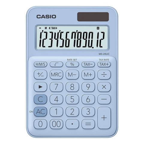 Számológép asztali CASIO MS 20 UC 12 digit világoskék - 12 számjegyű nagyméretű LCD kijelző - Funkció megjelenítés - 2018 Design Awards díj nyertes - Professzionális százalékszámítás - Nyereségszámítás a % gomb segítségével - Időszámítás - ÁFA sz