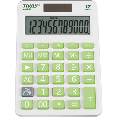 Számológép Truly asztali 6002-12 zöld 12 digites asztali számológép tizedes állítás 105 lépés visszaellenőrzési lehetőség GT funkció, visszatörlő gomb, „00” gomb napelemmel és elemmel működik nagy, döntött kijelző haszonkulcsszámítás független memóri