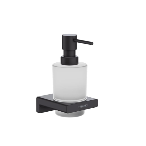 Szappanadagoló tartóval fekete matt színben színű. A Hansgrohe márkájú fürdőszobai kiegészítő szélessége 8,1 cm alapanyaga fém, üveg. Szerelési mód fúrással.
