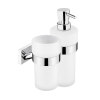 Adagoló és pohártartó. Matt üvegedények. Adagoló kapacitása 250 ml. Pumpás sárgaréz/króm.