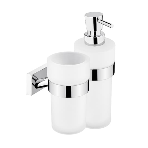 Adagoló és pohártartó. Matt üvegedények. Adagoló kapacitása 250 ml. Pumpás sárgaréz/króm.