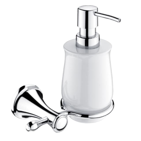 Folyékony szappanadagoló. Kerámia tartály 300 ml. Fogantyú sárgaréz. Műanyag szivattyú. Krómozott felület.