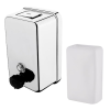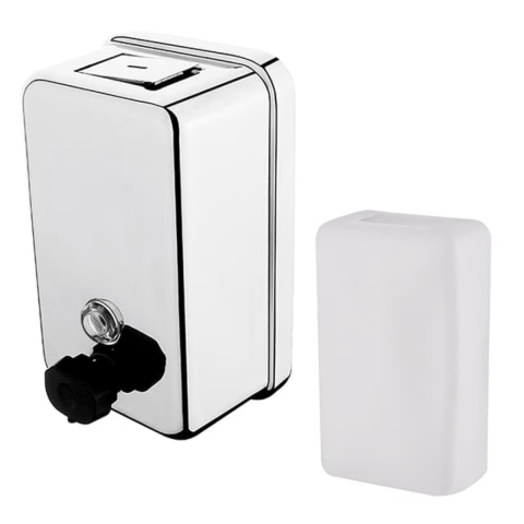 Fertőtlenítő gél vagy folyékony szappan adagoló függőlegesen. Polírozott rozsdamentes acél 1.4301. Térfogat 1100 ml. Fekete műanyag szivattyú.