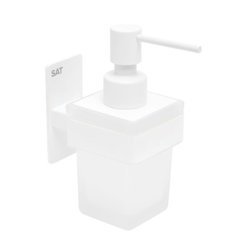 Szappanadagoló fehér színű. A SAT márkájú fürdőszobai kiegészítő szélessége 6,5 cm alapanyaga rozsdamentes acél. Fúrásmentes szerelés, csak ragasztással.