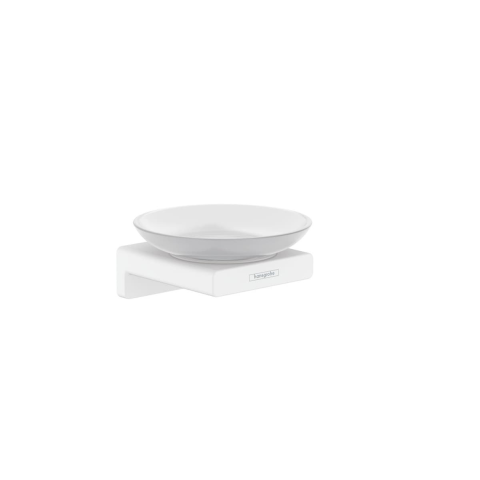 Szappantartó tartóval fehér matt színben színű. A Hansgrohe márkájú fürdőszobai kiegészítő szélessége 8,1 cm alapanyaga fém, kerámia. Szerelési mód fúrással.