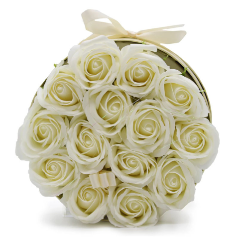 1 kép Szappanvirág ajándékcsokor - 14 krém színű rózsa - kerek dobozban GSFB-09