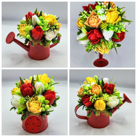 1 kép Szappanvirág csokor - Vegyes tulipán szappanvirág csokor - piros locsolókannában - 3.