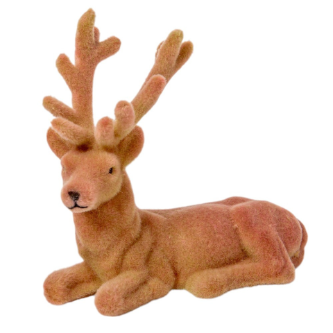 Szarvas fekvő flokkolt barnás pink 14cm dekorációs kellék 1 kép