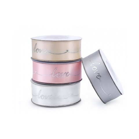 Szatén szalag fémes mintával Love - 13,5 m szalag, masni árgrafikon