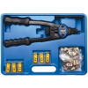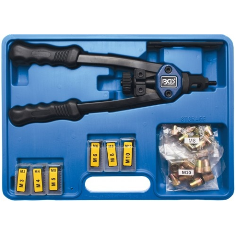 Ideális nehezen elérhető helyekhez; Alumínium és acél szegecsekhez is használható; Praktikus műanyag dobozban. Tartozékok: 10 db szegecs méretenként a következőkből: M3, M4, M5, M6, M8, M10 Technikai adatok: Szegecselő orrész / tüskepár: M3, M4,