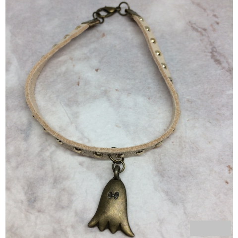 1 kép Szegecses, bézs színű bőrkarkötő szellem medállal
