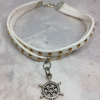 1 kép Szegecses, fehér színű bőrkarkötő kormánykerék medállal