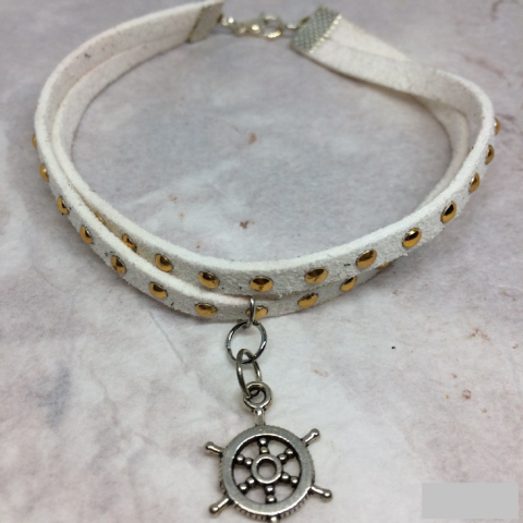 1 kép Szegecses, fehér színű bőrkarkötő kormánykerék medállal