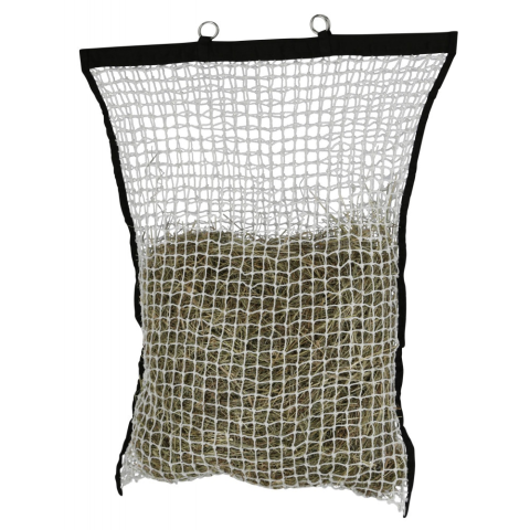 Szénaháló töltővel, 90x110 cm: Erős, tartós szénaháló lovaknak, biztonságos tépőzáras nyílással és praktikus töltőhurokkal. Ideális a széna tiszta és kényelmes etetéséhez. Szénaháló töltés segítővel - 90x110 cm – Praktikus megoldás a széna etetéséhez E