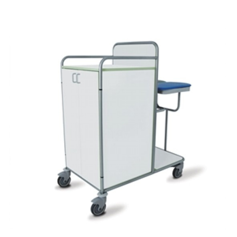 - Zárt karosszéria ajtókkal, 3 polccal, felsővel és 2 táskátartóval. - Laminált forgácslap test és rozsdamentes acél szerkezet - 4 görgővel ebből 2 fékezhető - Méret: 110 x 66 x 132 cm