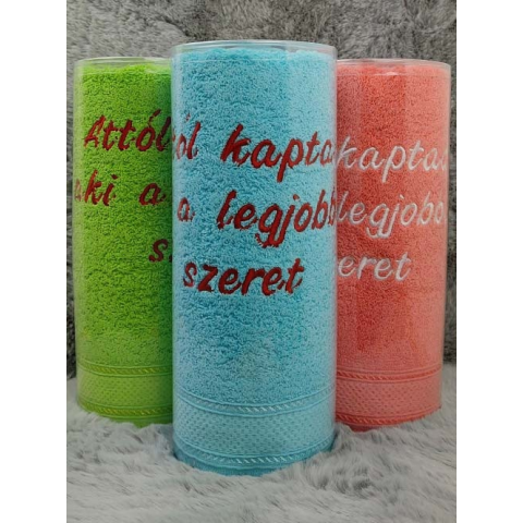 Legjobban szeretlek, hímzett törölköző Valentin napra, Attól kaptad aki a legjobban szeret felirattal. Szerelmes ajándék akár évfordulóra, karácsonyra is. Puha, 100 % pamut törölköző, mérete 70 x 140 cm. Műanyag henger csomagolásban szállítjuk. 70x140