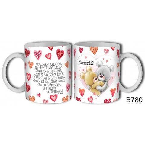 Feliratos bögre, macik, Valentin-nap 3 dl Anyaga: kerámia Befoglaló mérete: 12 x 8 x 9,5 cm Szerelemben lubickolva, első randi, vörös rózsa. Szemekben a csillogások, sosem szűnő csókos álmok. Két szív, hogyha együtt dobban, minden szikra lángra lobban. Ke