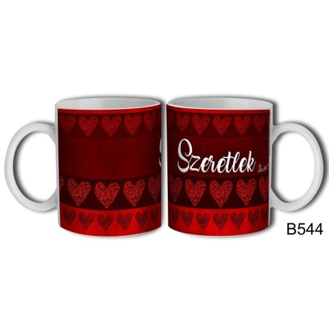 1 kép Szerelmes bögre, sötétpiros alapon szívek, szeretlek