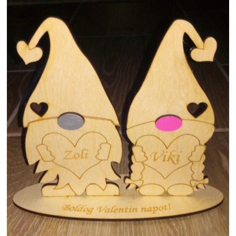 Valentin napi szerelmes manó pár. Kb. 15 cm magasak, 21 cm hosszú ovális talpon állnak, gravírozva. 3mm vastag rétegelt lemezből készültek. Az orruk egészségre ártalmatlan vízbázisú festékkel festett.