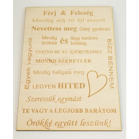 Szerelmes fatábla 3 mm vastag rétegelt lemezből,gravírozva.Mérete 15x21cm. Szerelmes Fa Tábla - Egyedi Ajándék a Szerelem Ünneplésére Fedezd fel a szerelem varázsát ezzel az egyedi, kézzel készült fa táblával! Tökéletes ajándék pároknak, házassági év