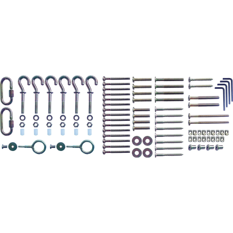 A szerelőkészlet a Chelsea FSC kerti hintaágy biztonságos rögzítésére és összeszerelésére alkalmas. A szállítási csomag tartalmazza a rögzítéshez szükséges csavarokat, anyacsavarokat, alátéteket, csavarhorgokat, karabinereket, takarósapkákat és imbuszkulcsokat.