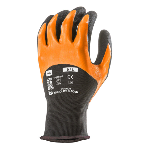 SZERELŐKESZTYŰ DUPLARÉTEGŰ ÖCS-IG NARANCS NITR MÁRTOTT_9 Fekete, varrás nélküli, poliészterrel erősített, 15-ös kötésű kesztyű, kötött mandzsettával.Duplán mártott: sima narancssárga nitril ökölcsontig, érdesített nitril tenyér.
