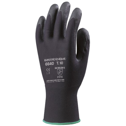 SZERELŐKESZTYŰ, PES, FEKETE HP HABOSÍTOTT PVC TENYÉRREL_7 Fekete, varrás nélküli nylonnal erősített, 15-ös kötésű kesztyű. Fekete PVC-habbal mártott tenyérrel és kötött mandzsettával OEKO-TEX® STANDARD 100 minősítéssel, CQ 1301/1, IFTH
