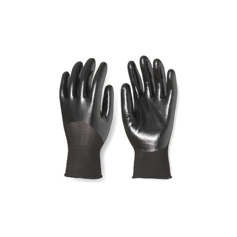 SZERELŐKESZTYŰ, SZÜRKE PA/FEKETE NITRIL MÁRTÁS, 3/4 HÁT_7 Fekete, varrás nélküli poliészterrel erősített kesztyű, ökölcsontig sima nitrillel mártva, kötött mandzsettával.