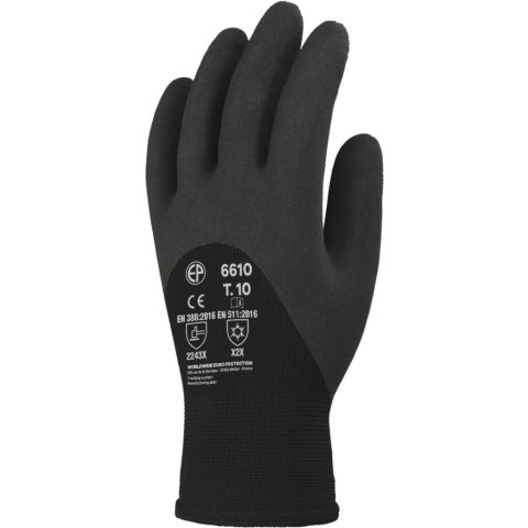 SZERELŐKESZTYŰ, TÉLI, FEKETE HP LATEX TENYÉR, 3/4 HÁT_11 Fekete, varrás nélküli, poliészterrel erősített kesztyű Fekete akril béléssel Fekete latex-habbal mártva ökölcsontig Kötött mandzsettával
