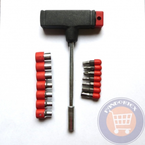 A készlet tartalmaz 7 darab csavarhúzó feje és 7 darab dugókulcsot. A T-nyelű nyélbe mágnes segítségével rögzíthetjük a csavarhúzó fejeket.7 darabos dugókulcs méretei: - 4 mm, - 5 mm, - 5.5 mm, - 6 mm, - 7 mm, - 8 mm és 9 mm.