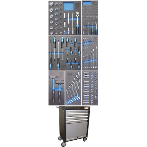 A BGS 2004 szerszámkocsi 7 db ellenálló habból készült szerszámtálcába rendezett szerszámokkal feltöltve. Az 1/3-os szerszámtálcák tartalma: 2 részes lakatos és kőtörő kalapács készlet (BGS 4046) 12 részes csillag-villáskulcs készlet, 6-22 mm (BGS 40