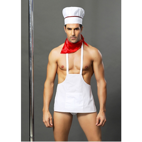 Szexi szakács szett.Hátul kötős szakács kötény(elöl zsebes).Szakács sapka.Piros nyak kendő.Fehér alsónadrág.