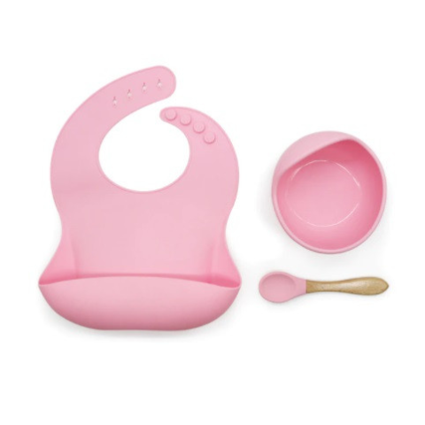 Szilikon étkészlet babáknak, állítható előke és vákuumtalpas tányér kanálkával rózsaszín