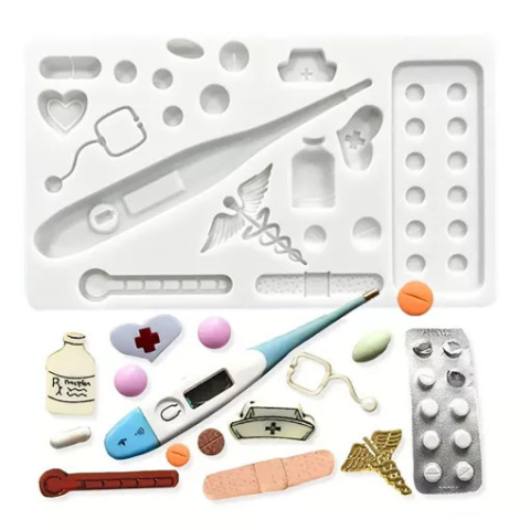 Orvosi eszközöket mintázó szilikon marcipán és fondant forma, melynek segítségével akár otthon is el tudod készíteni a süteményekre vagy tortára szánt dekorációt. A forma használata egyszerű, hiszen csak meg kell tölteni marcipánnal vagy fondanttal a min