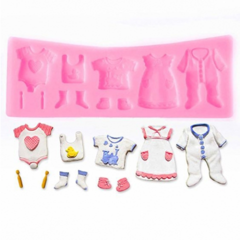 Anyaga: szilikon Teljes forma mérete: 65 mm × 175 mm A forma vastagsága: 7 mm A minták mérete: - Kezeslábas: 38 mm × 50 mm - Kis ruha: 32 mm × 42 mm - Póló: 37 mm × 25 mm - Előke: 18 mm × 21 mm - Rugdalózó: 32 mm × 35